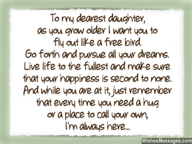 1) To my dearest daughter, as you grow older I want you to fly out like a free bird. Go forth and pursue all your dreams. Live life to the fullest and make sure that your happiness is second to none. And while you are at it, just remember that every time you need a hug or a place to call your own, I’m always here. Love you.